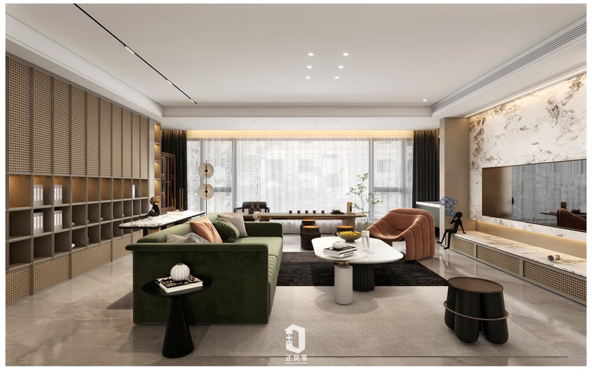 客廳陽臺納入主空間,讓整個客廳寬敞明亮,主人愛茶,這里成為品茗的最佳選擇。沖一壺茶,深嗅一息,享受歲月的寧靜與美好。 由于業主夫婦非常喜歡旅行,紀念收藏品不斷增加,基于收納需求的考量,沙發背景墻以柜體的形式呈現,藤編的柜門在光下若隱若現,虛實之間暗藏精致。黛綠意濃灰黃和煦,這樣的自然系配色,碰撞出一個溫馨有愛的家;