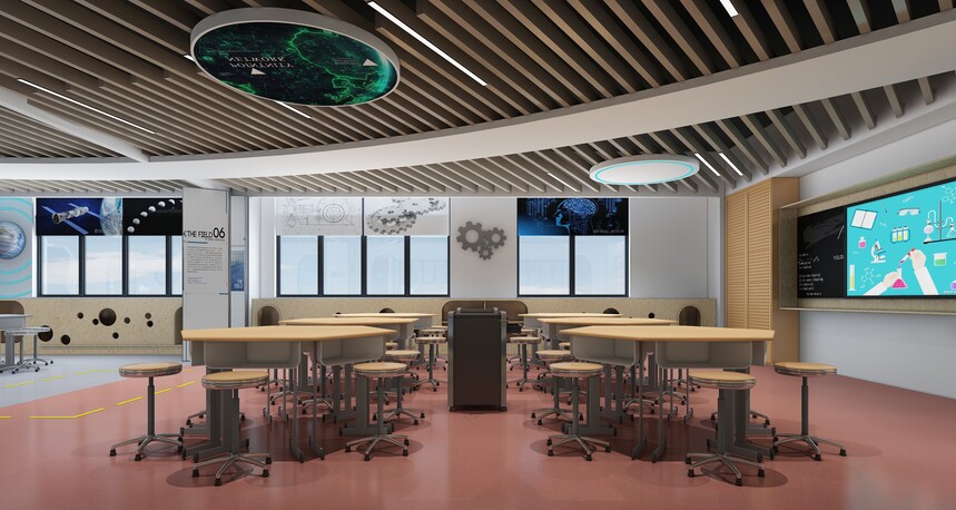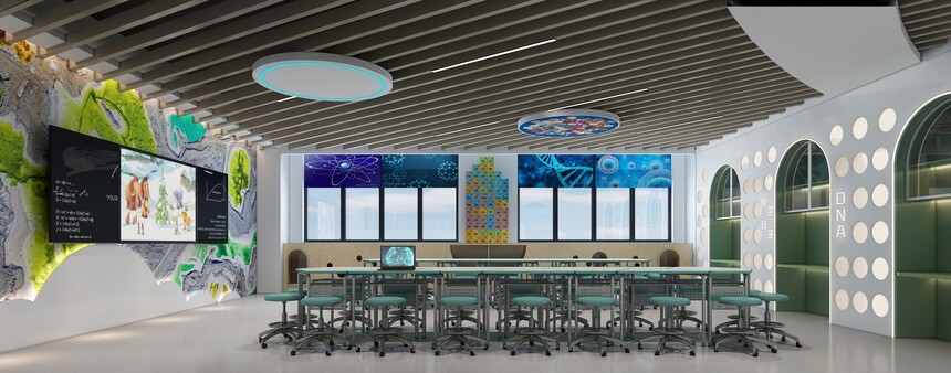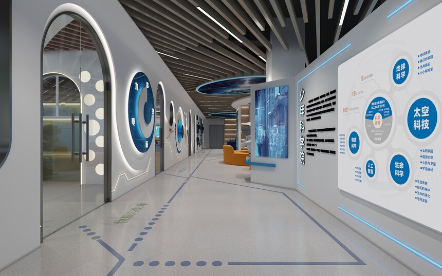從前廳的位置進入科學院的主要空間,不同的幾何體塊延伸了通道的空間感,同時有了宣傳和展示的作用,不僅提高了參觀者的視覺感受,也讓學生在進入教室之前就有了探究的欲望,圓弧形的處理方式既科幻又時尚,同時又有延續性,沒有陽角,對于孩子們的安全做了最大化的考慮。