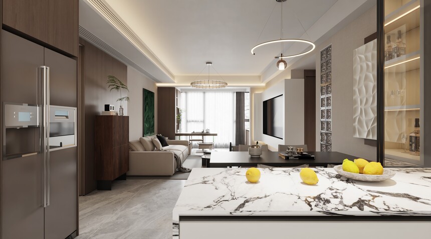 門廳兩側通頂的收納柜以斜角的狀態置放,隱匿了進門視角,避免直面客衛,也讓空間有了曲徑通幽的妙處。