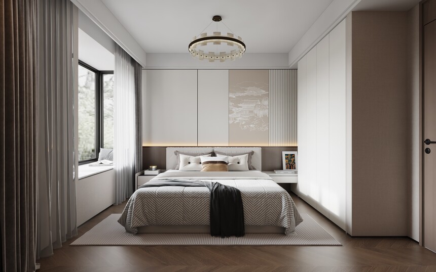 臥室不同材質與色彩的木飾面拼接和不同灰度圓色的引入不僅豐富了空間層次感,還讓空間氛圍更加治愈。