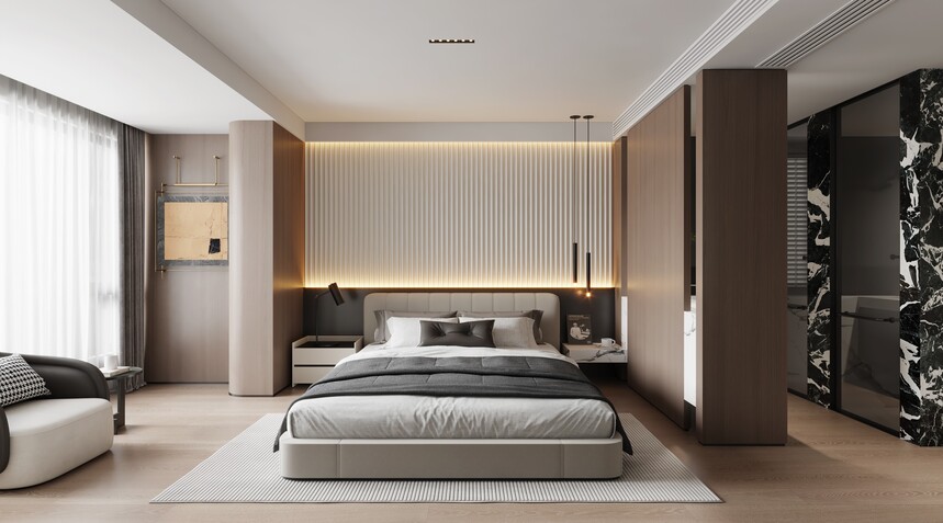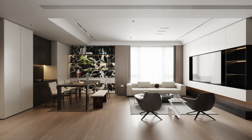 客廳的線條簡潔流暢,黑白灰與原木色的自然運用讓整個空間更顯溫潤沉靜。跳色的大理石背景柜作為點綴,無主燈的光線與自然光柔和過渡。