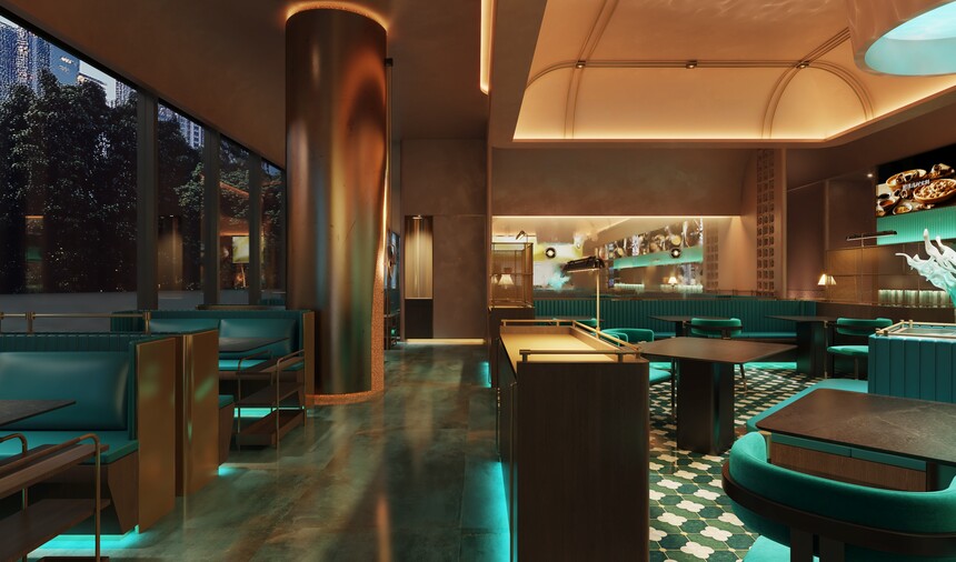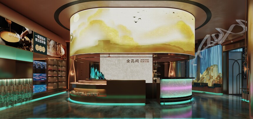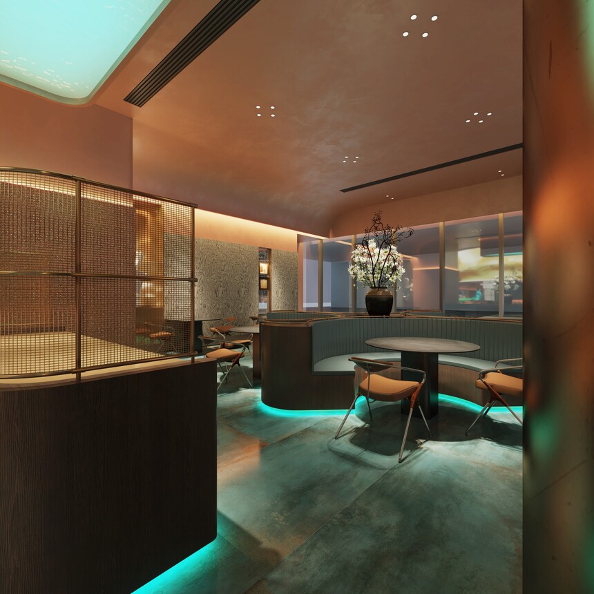 長廊的赤陶顆粒壁與水色地磚相襯, 點狀射燈暈開朦朧光暈,像把老巷的晚燈裁進了現代走廊。 青綠卡座與鎏金線條交織,是昆曲水袖的婉轉,又裹著賽博霓虹的輕芒;冰藍LED裝置如崖間凝水,讓煙火氣里飄著東方意境的留白。