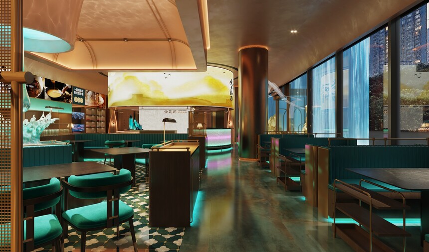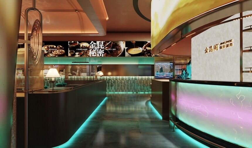 金昆閣奧體中心店項目名稱:金昆閣奧體中心店 項目地址:西安 項目面積900平 當銅爐的溫吞煙火撞上現代設計的細膩筆觸,「金昆閣」的空間便成了一卷流動的東方美學詩箋。