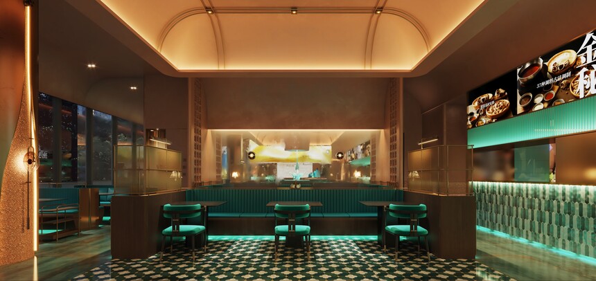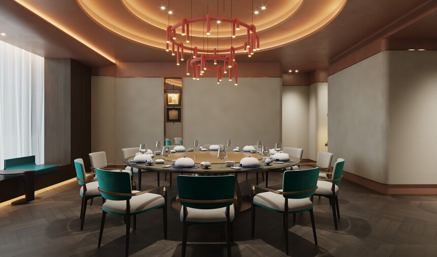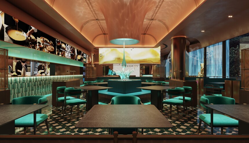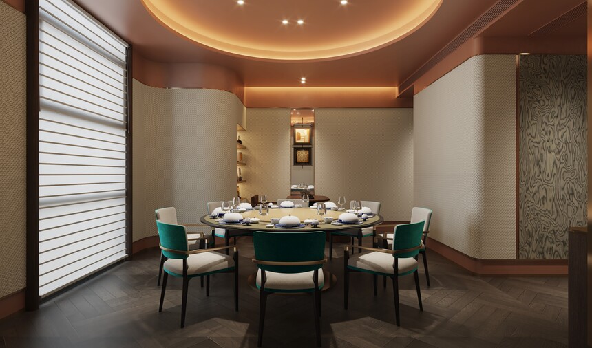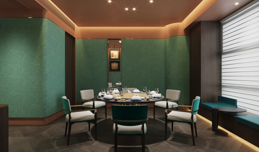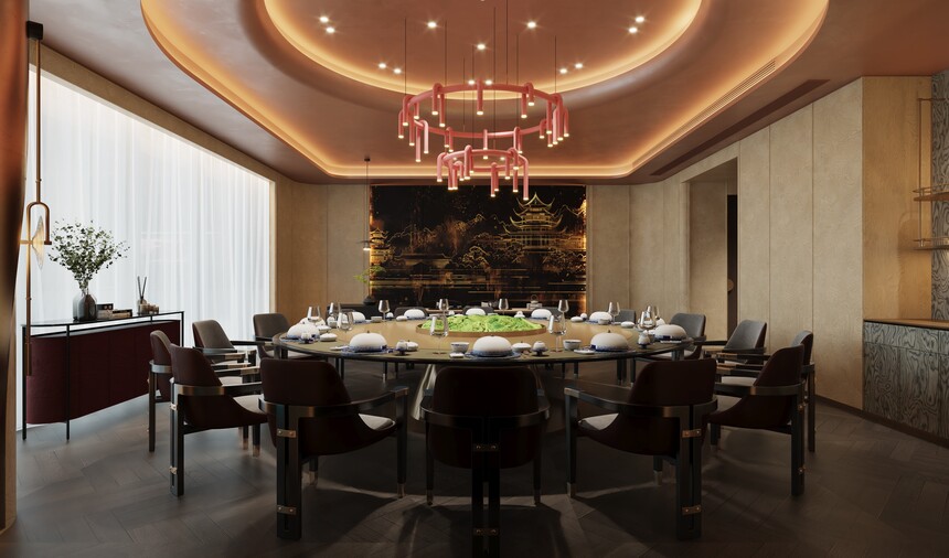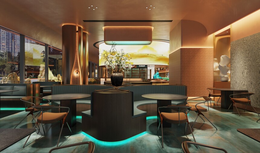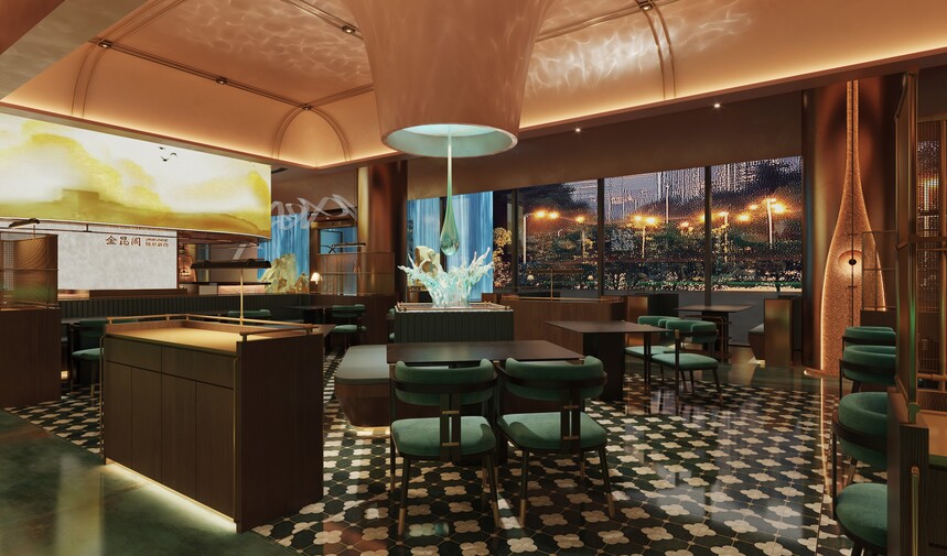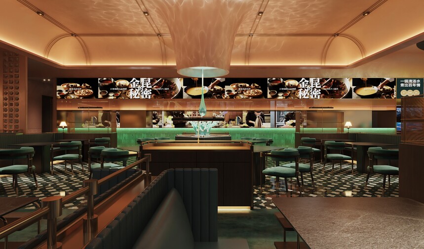 墨綠肌理墻似暈染的宋畫山水,暖銅色燈槽如月光漫過檐角,圓桌椅的青綠軟包是茶甌里漾開的春,在克制的明暗里,藏著中式宴飲的私密與矜貴; 材質、光影與色彩的韻律 —— 是銅爐沸湯時,古今美學在空間里的溫柔對談。
