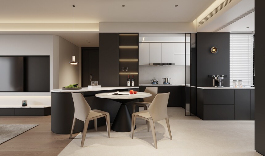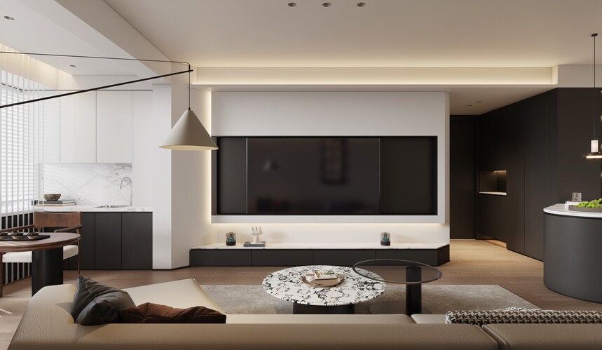 客廳與餐廚區(qū)無界相連,L型沙發(fā)與圓桌形成柔和的視覺弧線,深色木飾面與大理石臺面碰撞出天然質感,每一處材質都暗藏克制的奢華——布藝的溫潤、石材的冷冽、金屬的精致,在觸碰間喚醒感官的愉悅。 燈光是空間的隱秘書寫者:筒燈灑下均勻的背景光,吊燈在吧臺上方勾勒出輕盈的幾何線條,落地燈則以錐形光暈為閱讀角添一筆暖意。暗藏燈帶如呼吸般漫射,讓墻面裝飾的方塊陣列仿佛懸浮于暮色中。