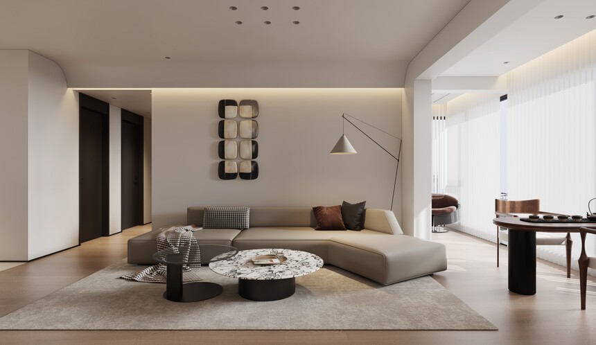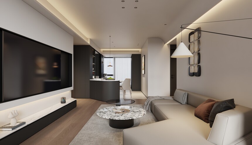 御景城斜置的邊柜增加了空間的趣味與藝術,畫面仿佛被無限延伸,灰白基調如一幅留白的畫卷,以通透的布局勾勒出鮮活生活的呼吸感。
